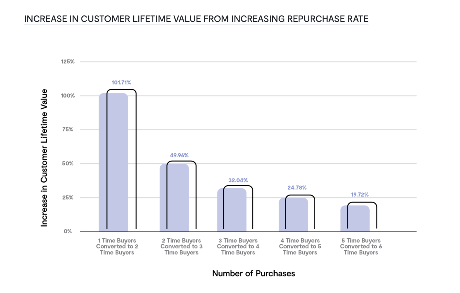 What’s even more daunting is all of the privacy changes coming over the next few years (think Chrome’s pending end of support for third-party cookies and iOS15). With that, loyalty is even more critical. You need to get smart about the data you have now to bring shoppers back, again and again. Because the more often they buy, the higher their lifetime value. In fact, we found that the second purchase delivers a massive boost in lifetime value at 101%.