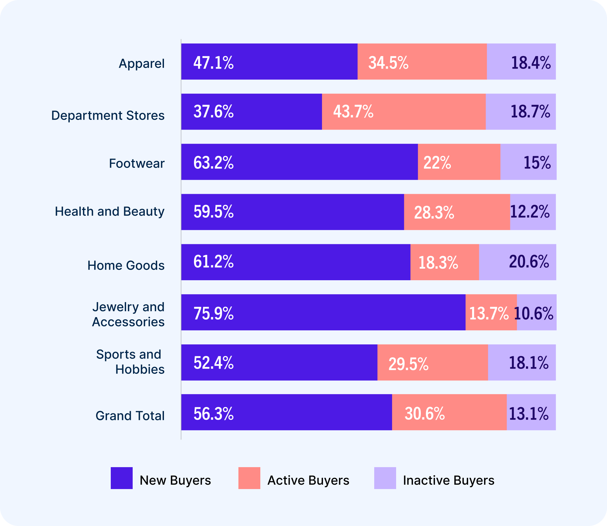 Jewelry and accessories, and home goods purchases are likely to be bigger and less frequent. These verticals have the most new and inactive buyers, respectively, which demonstrates how crucial it is to build loyalty.