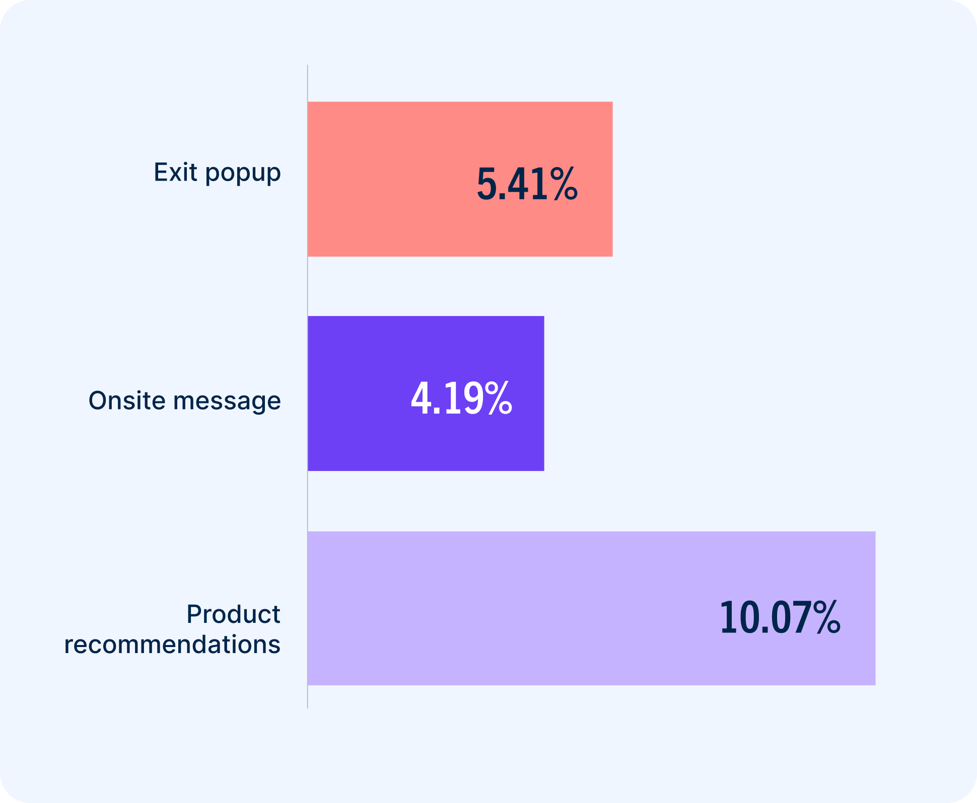 Shoppers often visit a retailer’s website unsure what exactly they’re looking for. Product recommendations help curate the catalog and account for up to 31% of ecommerce revenue. Our benchmarks back that up. Product recommendations drove far more conversions than exit popups or onsite messages, which are defined as site campaigns with offers or informational content.