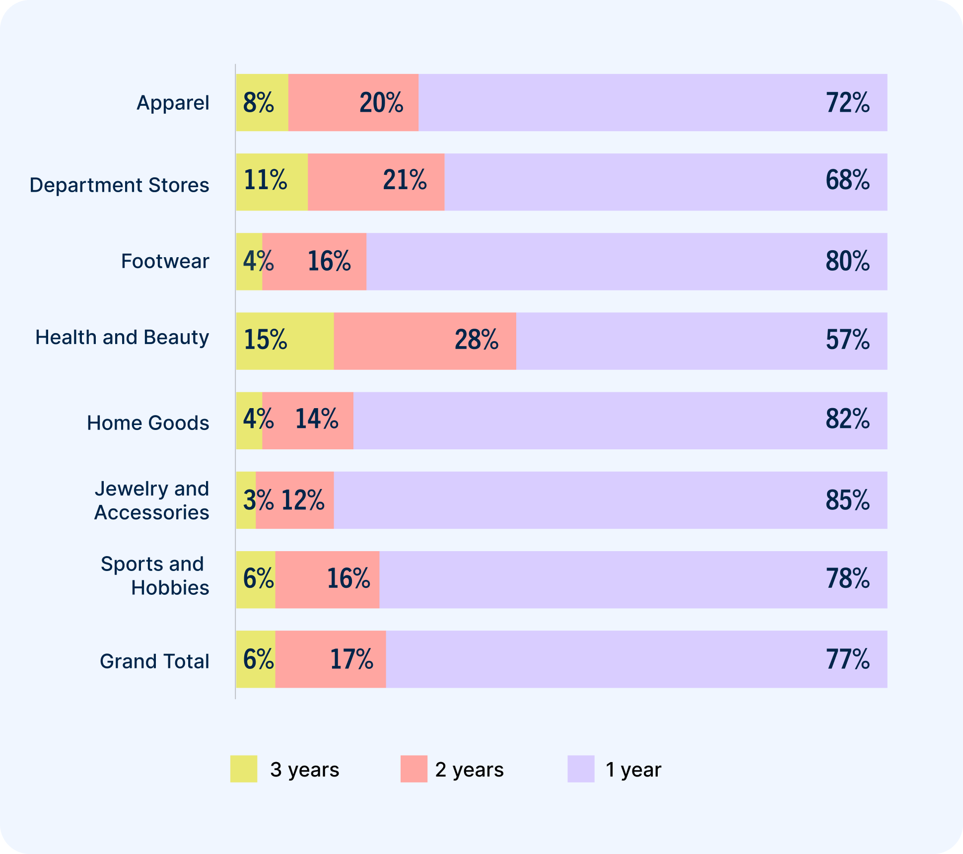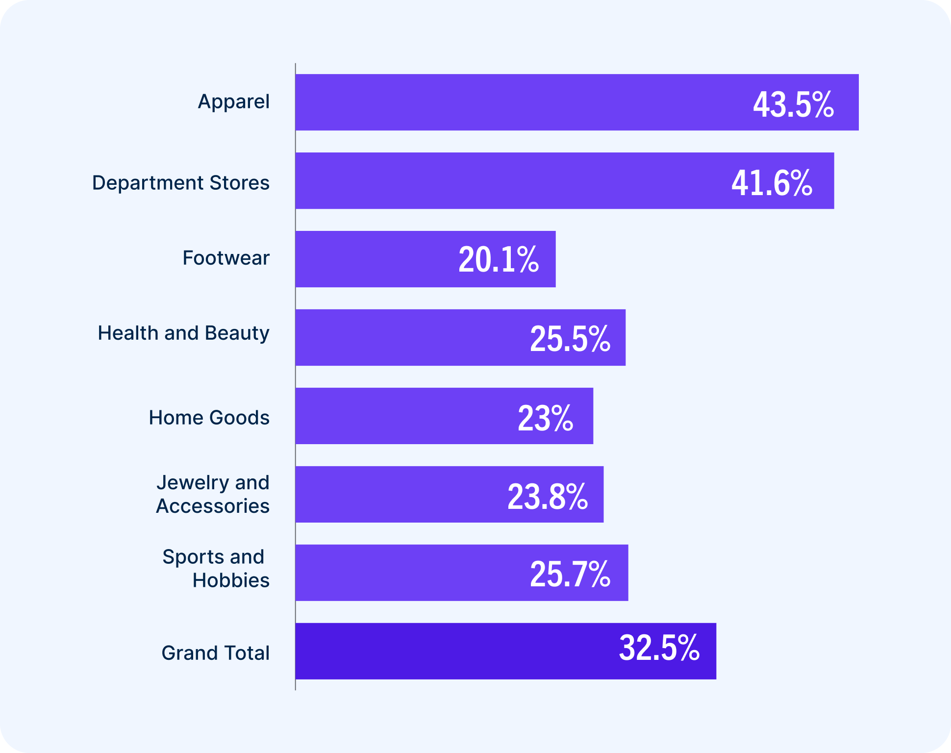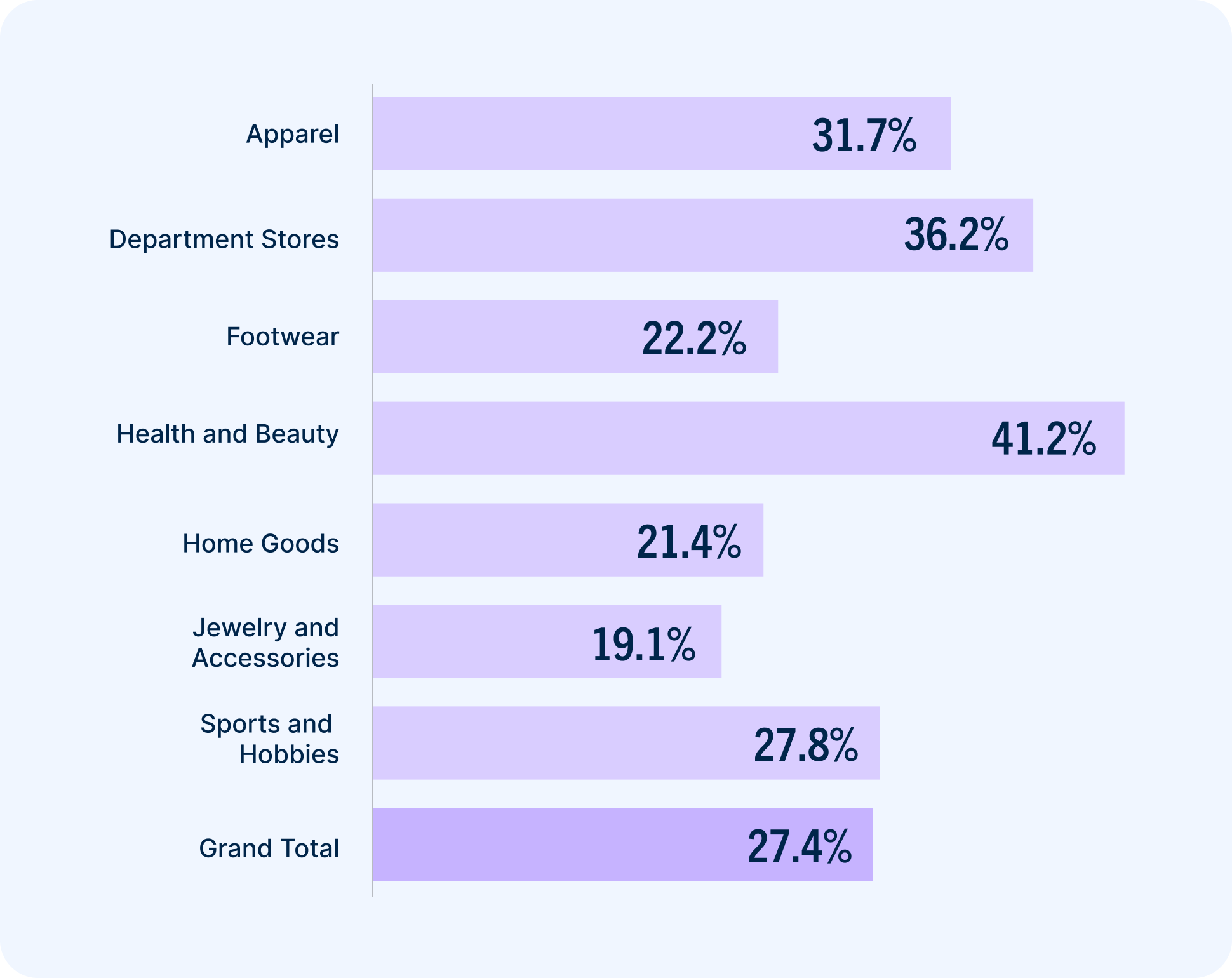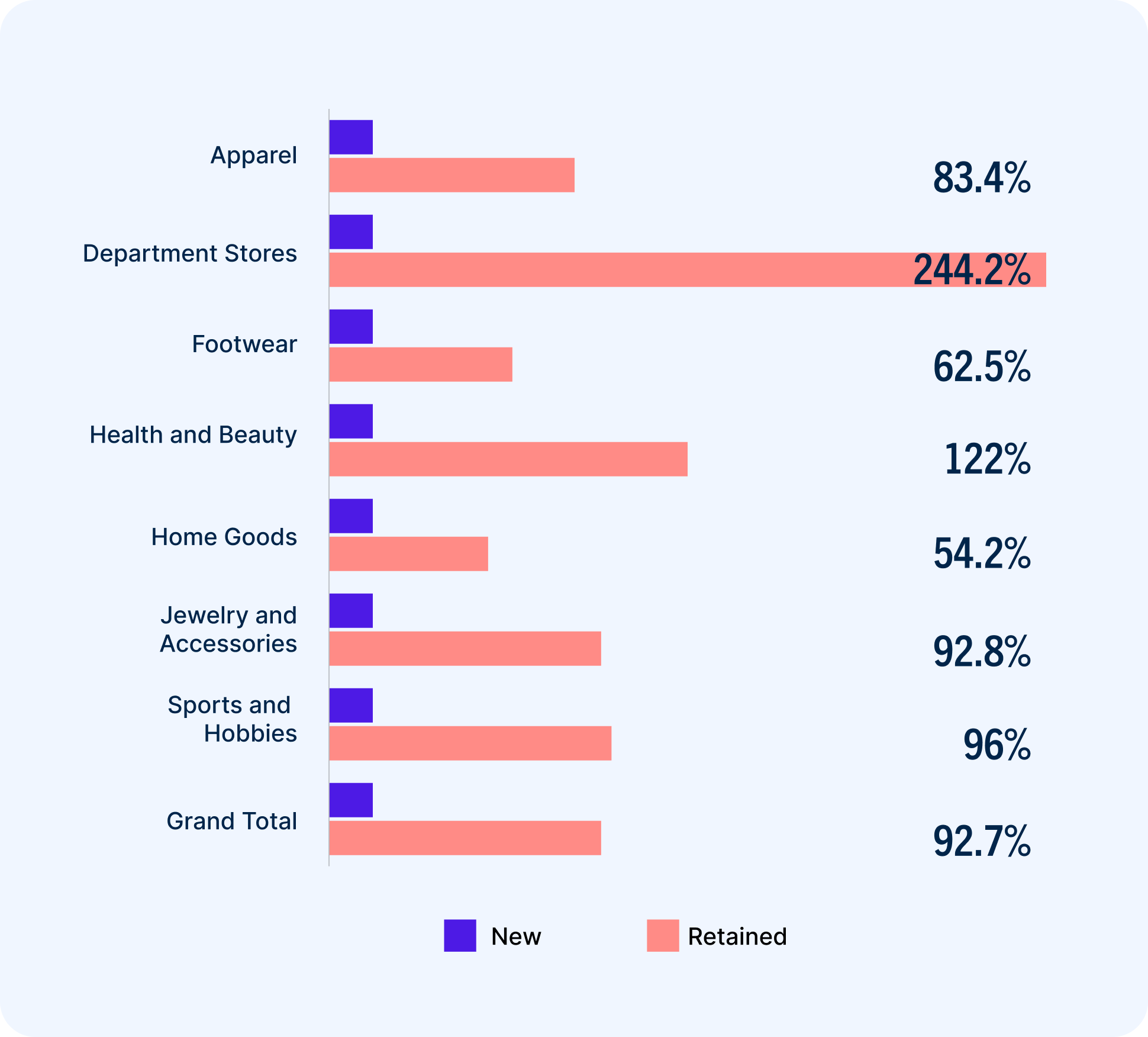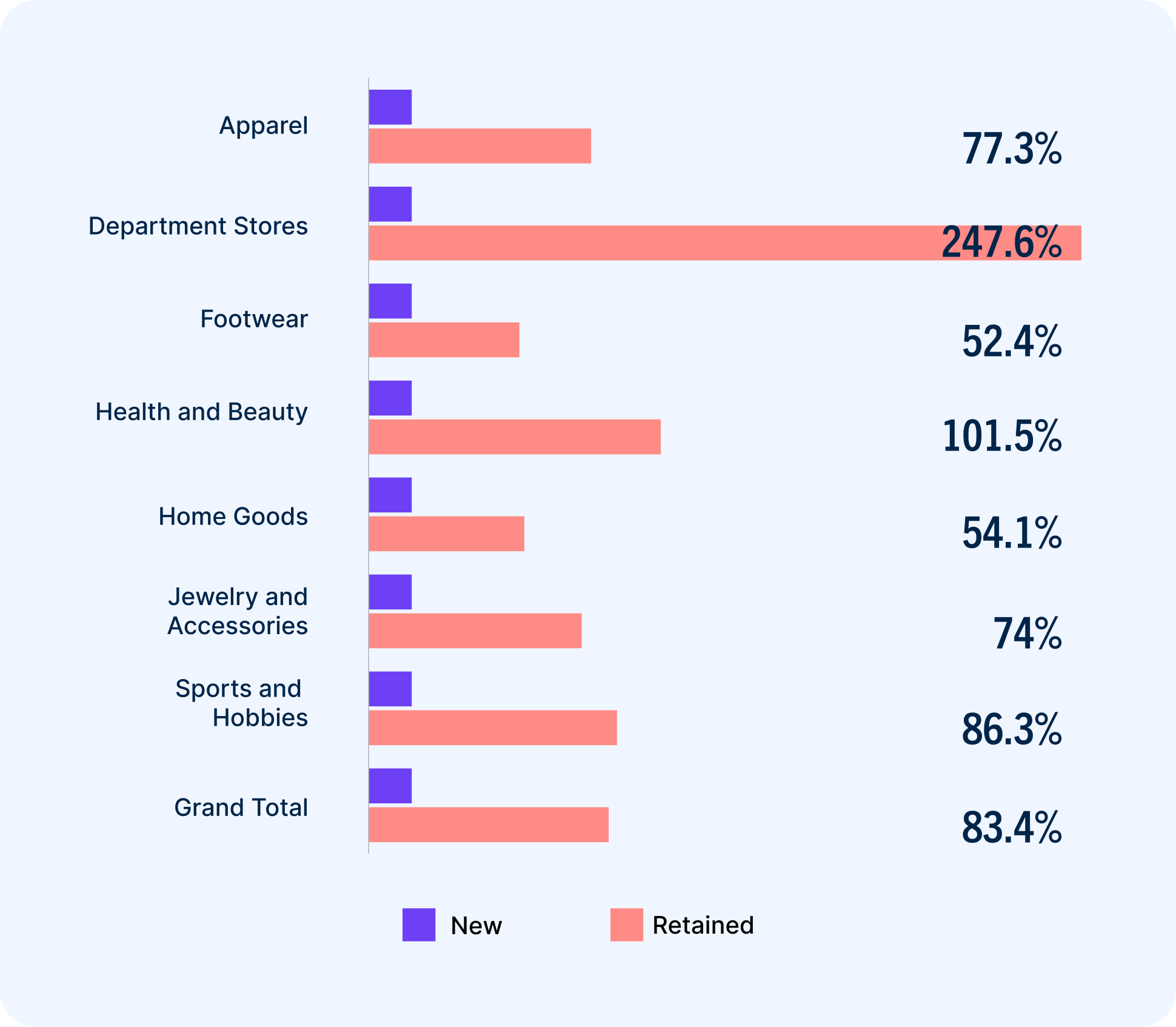 Because their one-stop-shop nature lends itself to repeat purchases, department stores have particularly strong active customer bases. Apparel retailers weren’t too far behind, with large product catalogs and many opportunities for complementary purchases and cross-selling.