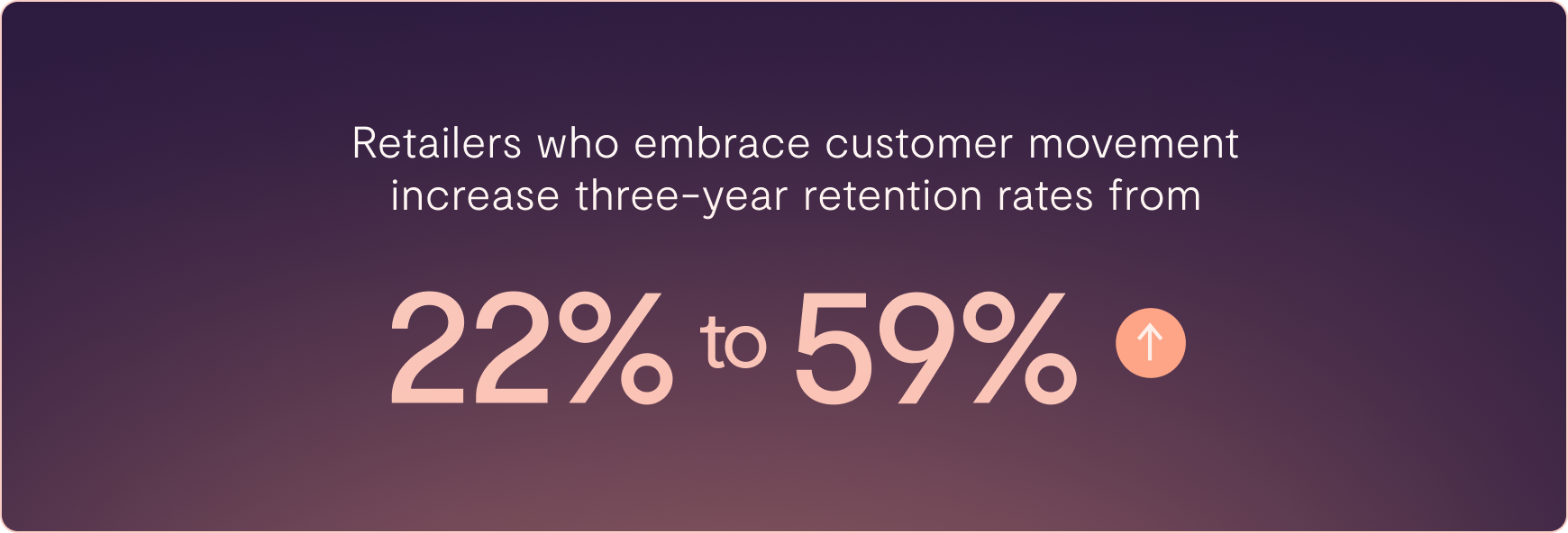 In a market where competition is fierce and loyalty is hard-earned, customer movement allows luxury brands to deliver timely, targeted messages, turning casual interest into lasting relationships. It’s no surprise retailers who adopt customer movement increase three-year retention rates from 22% to 59%.