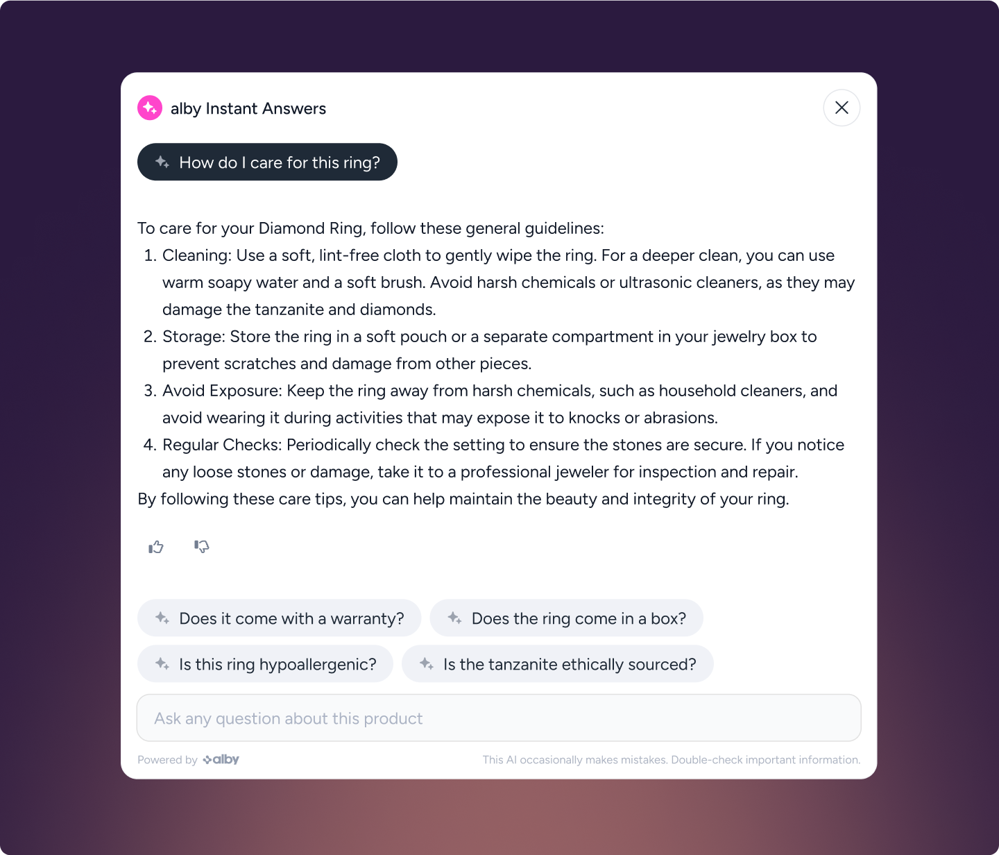 Another way to create a seamless discovery experience is by leveraging an AI shopping agent like alby. Instead of leaving shoppers to search on their own, AI shopping agents guide them to ideal products in real time. For a gift shopper scrambling for a last-minute anniversary present, Al can instantly surface the season’s most coveted, limited-edition pieces. Meanwhile, for a first-time buyer hesitating over a luxury handbag, the agent can guide them to timeless, entry-level designs that hold their value and stand as brand icons